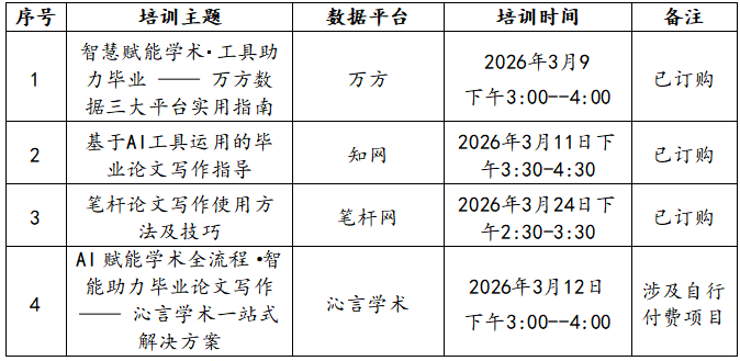 为帮助我校毕业生读者更好的完成毕业论文,提升文献检索效率、掌握学术规范与论文排版技巧,图书馆定于3月举办毕业论文写作专题培训,相关培训时间安排如下: